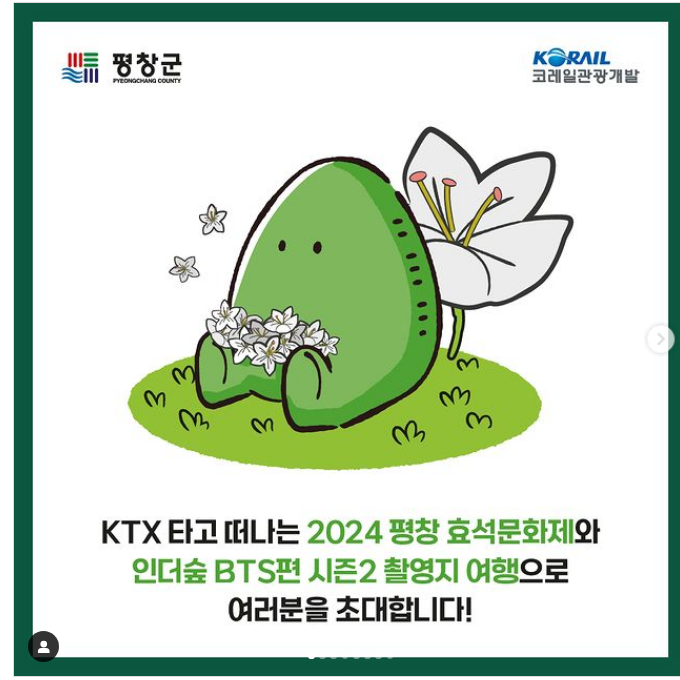 [스포츠서울ㅣ김기원기자]평창군은 평창 효석문화제 기간에 맞춰 효석문화제와 방탄소년단(BTS) 자체 콘텐츠 ‘인더숲’ 촬영지를 연계한 KTX 원데이 투어 관광상품을 운용할 계획이라고 밝혔다.