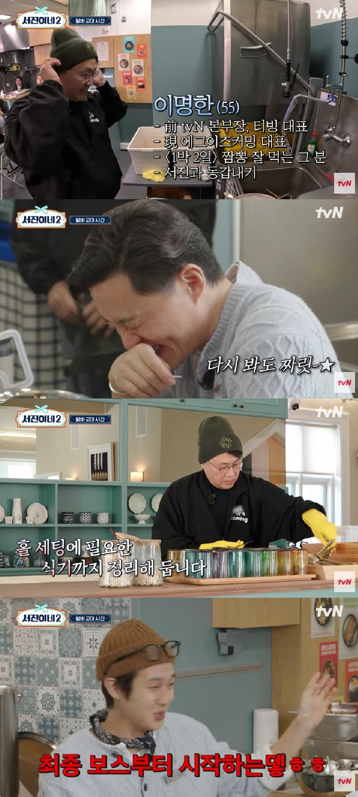두 사람이 잠시 식사를 하던 사이 제작진은 “우리 아르바이트생 바꿉니다”라며 새로운 저녁 아르바이트생의 등장을 알렸다. 주방에 수줍게 들어선 인물은 바로 이명한 대표. 전 KBS2 ‘1박2일’ CP이자 tvN 콘텐츠본부장 겸 티빙 대표를 맡았던 이 대표는 현재는 ‘서진이네’ ‘삼시세끼’ 등을 제작하는 콘텐츠제작사 에그이즈커밍의 대표를 맡고 있다.