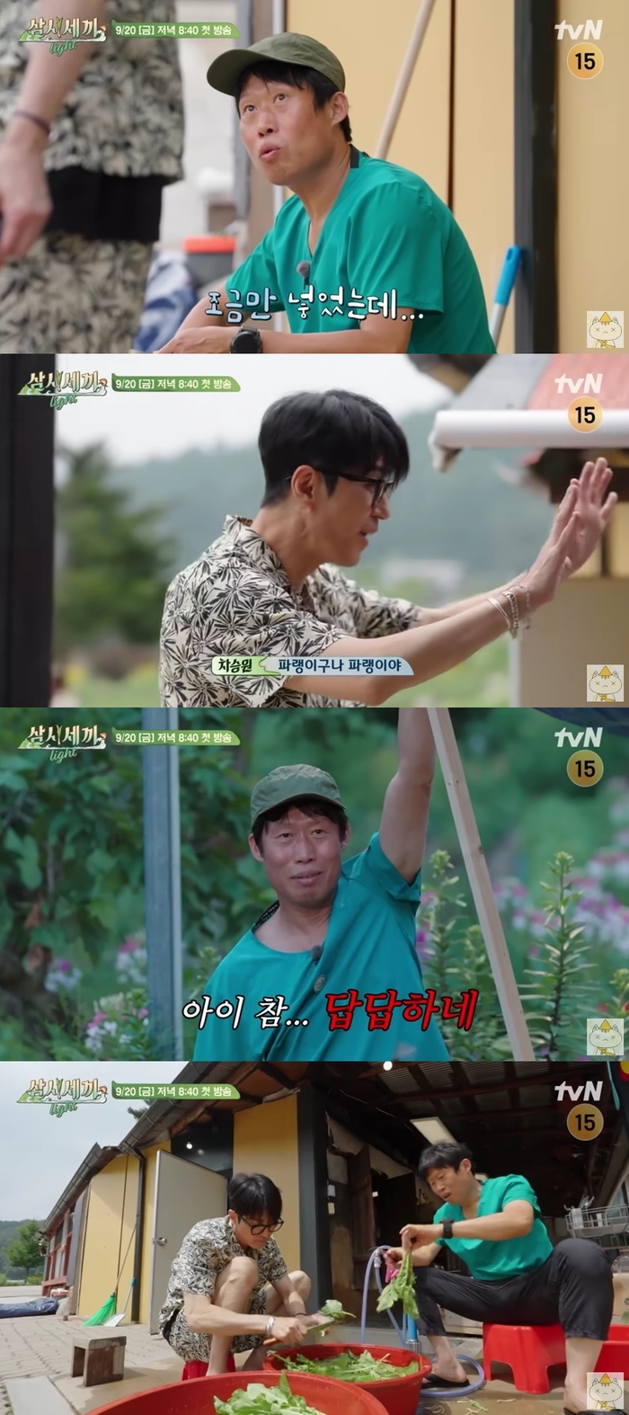 유해진이 마당에 해가림용 천막을 치는 가운데 차승원이 “여기에 박으면 되는 거 아니냐”라며 밭을 가리키자 유해진은 “아유 참 답답하네”라며 구박했다.