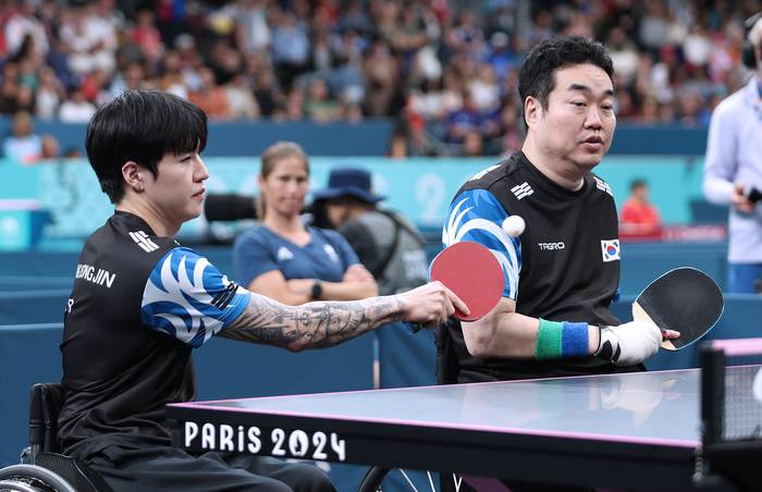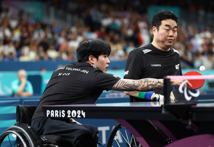 [스포츠서울 | 파리=김동영 기자] 대한민국 탁구 남자복식(MD4 등급)의 장영진(31·서울특별시청)-박성주(45·토요타코리아)조가 생애 첫 패럴림픽 무대에서 값진 은메달을 목에 걸었다. 분명 성과를 냈지만, 장영진-박성주는 아쉬움에 고개를 숙였다.