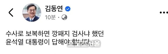 〔스포츠서울│수원=좌승훈기자〕김동연 경기도지사는 1일 자신의 SNS에 “어제 봉하마을에서 노무현 대통령님을 뵙고 오는 길에 기가 막힌 소식을 접했다.임기 내내 전 정권 인사들을 수사해 온 검찰이 급기야 문재인 전 대통령을 피의자로 적시했다. 이쯤 되면 막 나가자는 것”이냐고 했다.