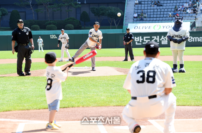 SSG 노경은의 부친 노의귀 옹이 1일 인천 SSG랜더스필드에서 열린 2024 KBO리그 SSG와 NC의 경기에 앞서 시구를 하고 있다. 시타는 노경은의 아들 권후 군이 시포는 노경은이 맡았다. 2024. 9. 1.