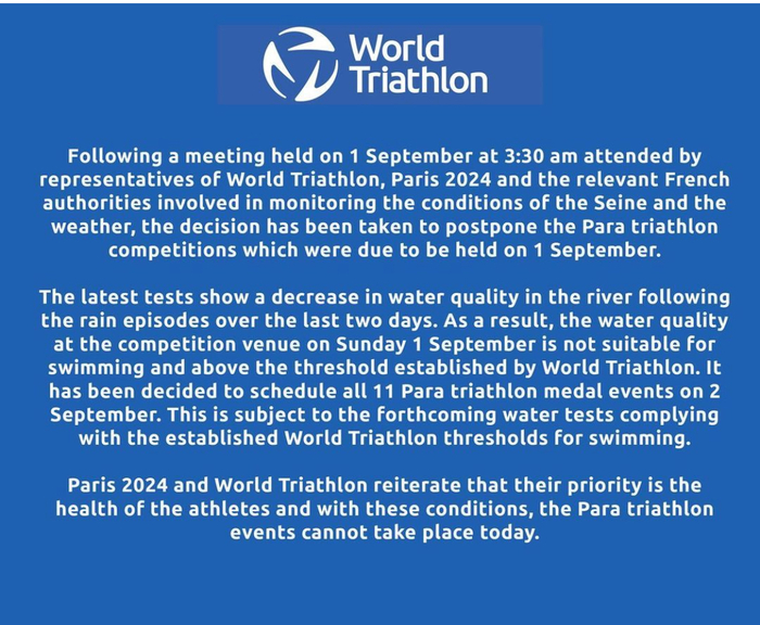 연맹은 “최근 테스트 결과 이틀간 내린 비로 센강의 박테리아 수치가 급증해 수질이 악화됐다. 센강의 수질이 수영하기에 적합하지 않고, 세계연맹의 기준치를 초과했다. 우리 연맹과 파리2024 조직위는 선수들의 건강이 최우선이며 이런 상황에서 철인3종 경기를 현재 개최할 수 없음을 다시 한번 강조한다”고 설명했다.