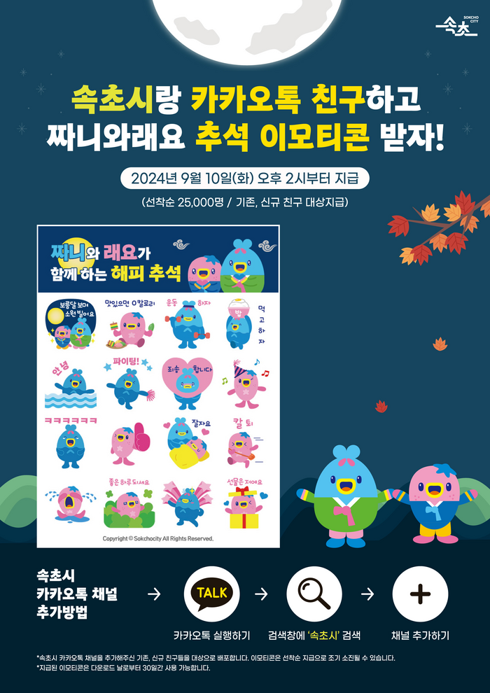 [스포츠서울ㅣ김기원기자]속초시가 추석을 앞두고 시 대표 캐릭터 ‘짜니와 래요’의 카카오톡 이모티콘을 제작해 오는 9월 10일(화) 오후 2시부터 무료 배포한다.