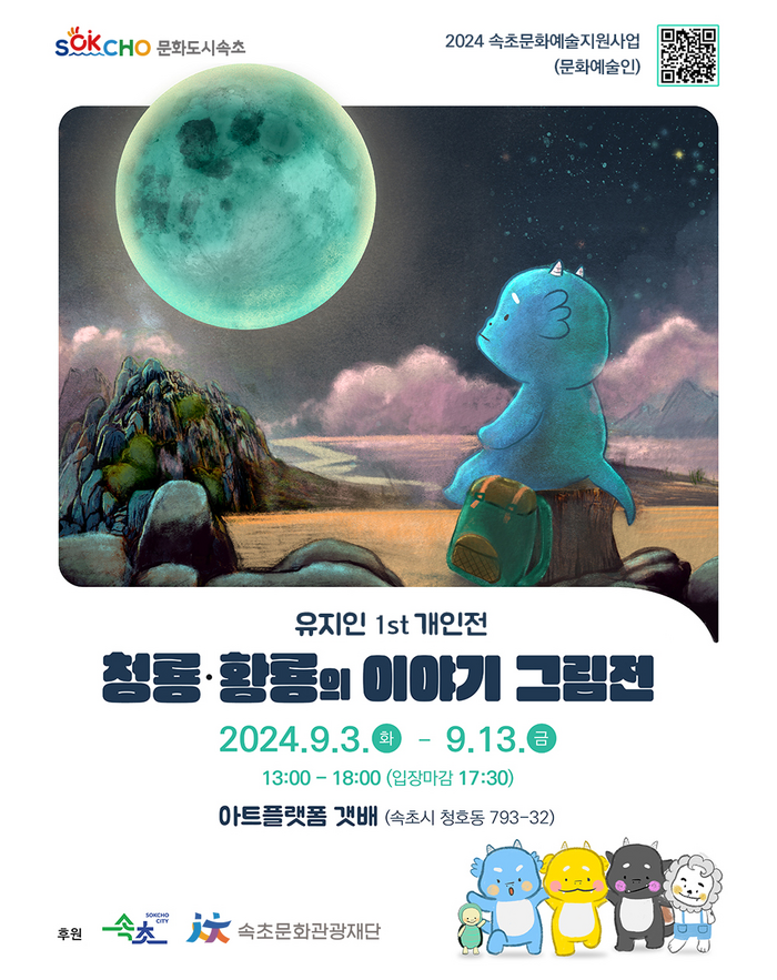 특히, 캐릭터 분야 유지인 작가는 속초에서 활동 중인 로컬 크리에이터로, 첫 개인전 <청룡·황룡의 이야기 그림전> 개최를 앞두고 있다. 불편한 부탁을 거절하지 못해 겪었던 어려움을 주인공 비드를 통해 풀어낸 자전적 전시로, 2024년도 강원 콘텐츠IP 개발 지원사업 선정작인‘내 마음을 살펴주는 수호신’ 캐릭터도 함께 선보인다. 9월 3일부터 13일까지 속초 아트 플랫폼 갯배에서 열린다.