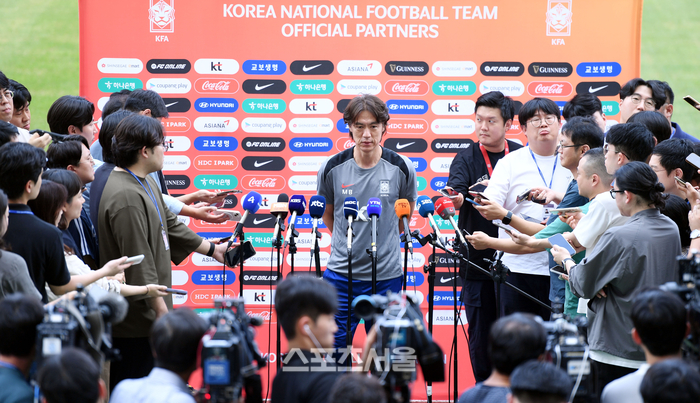 축구대표팀 홍명보 감독이 2일 고양종합운동장에서 인터뷰를 하고 있다. 축구대표팀은 5일 서울월드컵경기장에서 팔레스타인과 북중미월드컵 아시아 지역 3차 예선 1차전을 치른 뒤 10일 오만과 2차전을 소화한다.