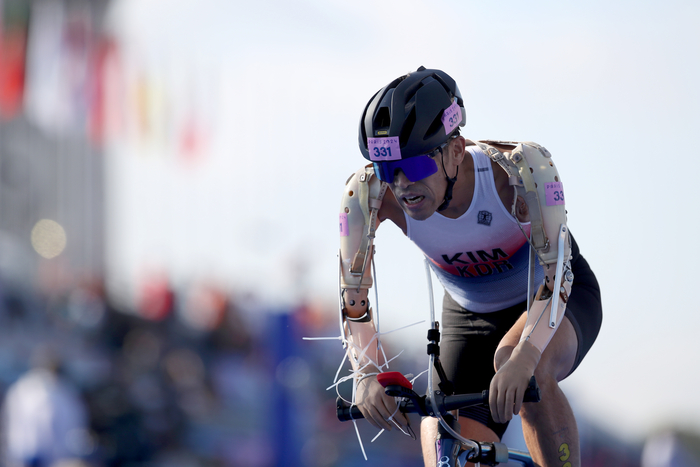 이날 김황태는 수영을 24분58초 기록으로 마쳤다. 바로 앞 선수와 7분여 차이가 나는 꼴찌(11위)다. 가장 빨리 사이클 종목에 임했으나 이번에는 사이클 손잡이와 연결된 보조 의수가 문제였다.