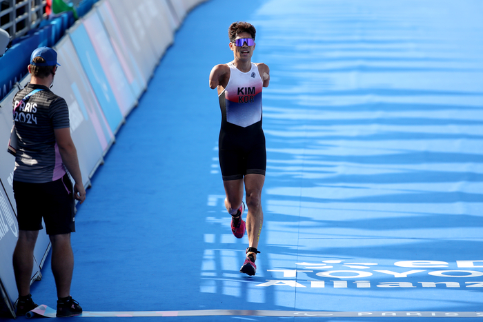 김황태는 2일(현지시각) 프랑스 파리 알렉상드르 3세 다리 부근에서 열린 2024 파리 패럴림픽 남자 트라이애슬론(장애 등급 PTS3)에서 1시간24분01초 기록으로 결승선을 통과했다. 전체 10위다. 패럴림픽 트라이애슬론은 수영 750m, 사이클 20㎞, 달리기 5㎞ 코스 합산 기록으로 최종 순위를 정한다.