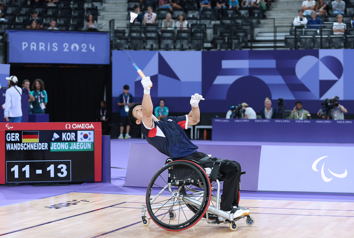 정재군은 2일(현지시간) 프랑스 파리 포르트 드 라 샤펠 아레나에서 열린 2024 파리 패럴림픽 배드민턴 남자 단식 WH1등급 동메달 결정전에서 토마스 반트슈나이더(독일)에 0-2(24-26 11-21)로 패했다.