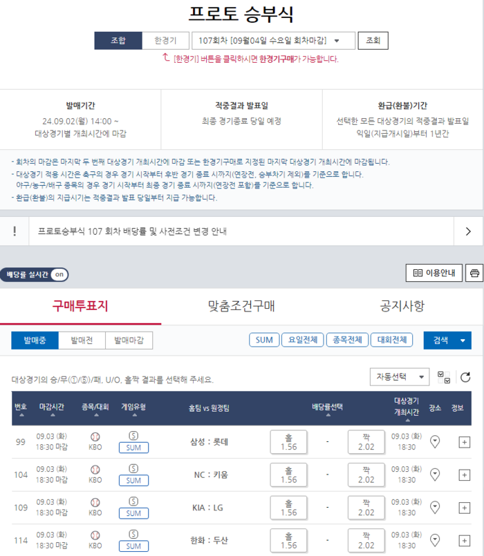 프로토 승부식 107회차에서 ‘SUM’ 신규 유형에 해당하는 경기는 삼성-롯데(99번)전을 비롯해 NC-키움(104번), KIA-LG(109번), 한화-두산(114번)전이며, 구매자는 ‘홀’과 ‘짝’ 중에 한 가지를 선택할 수 있다.