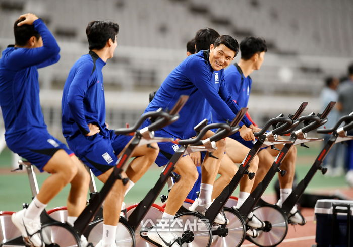 축구대표팀 김민재가 3일 고양종합운동장에서 북중미월드컵 아시아 지역 3차 예선을 앞두고 훈련을 하며 설영우와 이야기를 나누고 있다.