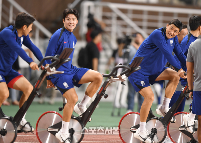 축구대표팀 김민재가 3일 고양종합운동장에서 북중미월드컵 아시아 지역 3차 예선을 앞두고 훈련을 하며 이강인과 이야기를 나누고 있다.