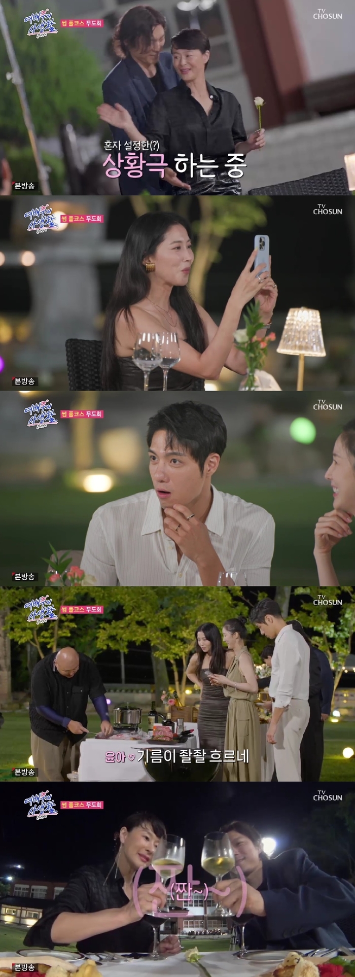 ‘꿀잼각’ 3인석에 대화가 쏟아지는 가운데 노성준은 대뜸 오윤아에게 “지금 보니까 웃는 게 (블랙핑크) 제니 닮았다”라며 푹 빠진 모습을 보여 웃음을 자아냈다. 예지원 이동준 커플도 다정하게 스테이크를 썰어 먹으며 눈은 이수경 테이블에 집중했다.