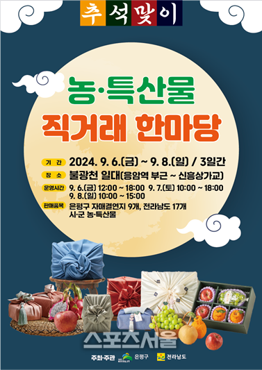 [스포츠서울|조광태기자] 전라남도가 추석을 맞아 오는 6일부터 3일간 서울 은평구 불광천에서 전남 농특산물을 홍보 판매하는 직거래 한마당 행사를 개최한다.