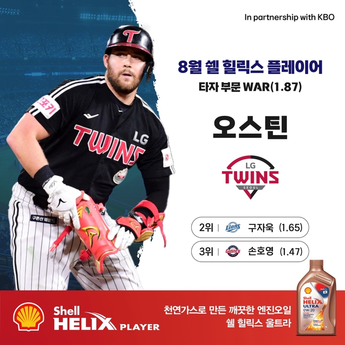 쉘힐릭스플레이어 타자 부문 수상자는 8월 WAR 1.87을 기록한 LG 내야수 오스틴 딘(31)에게 돌아갔다. 오스틴은 8월 월간 35 타점(1위), 홈런 9개(1위), OPS 1.160(1위)를 기록하며 시즌 막바지 상위권 경쟁에 힘을 보태고 있다. 또한 오스틴은 지난 24일 경기에서 LG 구단 역대 최초로 30홈런-100타점 기록을 달성하며, LG 트윈스의 새 역사를 써 내려가고 있다.