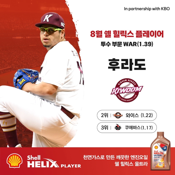 ‘쉘힐릭스플레이어’는 WAR(대체 선수 대비 승리 기여도)을 기반으로 선정하며, 8월 투수 부문에서는 월간 WAR 1.39를 기록한 키움 선발 후라도(28)가 선정됐다.