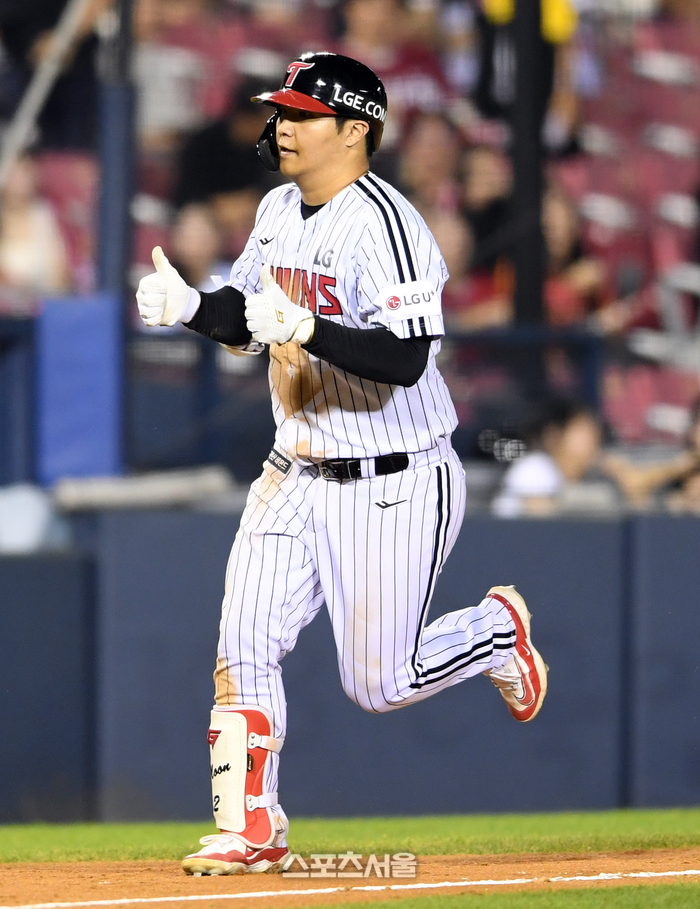 LG 문보경이 4일 잠실구장에서 열린 2024 KBO리그 SSG와 경기 5회말 2사 SSG 송영진을 상대로 솔로 홈런을 치고 정수성 코치와 하이파이브를 하고 있다. 문보경의 시즌 18호 홈런. 2024. 9. 4.