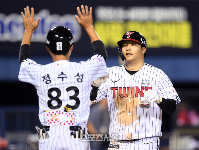 LG 문보경이 4일 잠실구장에서 열린 2024 KBO리그 SSG와 경기 5회말 2사 SSG 송영진을 상대로 솔로 홈런을 치고 정수성 코치와 하이파이브를 하고 있다. 문보경의 시즌 18호 홈런. 2024. 9. 4.