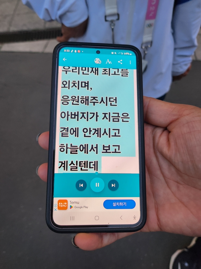 전민재는 스마트폰에 쓴 편지를 음성으로 변환해 취재진에게 들려주다 연신 눈물을 훔쳤다. 특히 4월 눈을 감은 아버지 이야기를 담은 구간에서는 고개를 떨구고 울었다.