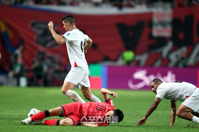 이강인이 5일 서울월드컵경기장에서 열린 2026 북중미월드컵 3차 예선 팔레스타인과 경기에서 상대와 볼다툼을 하다 넘어지고 있다.