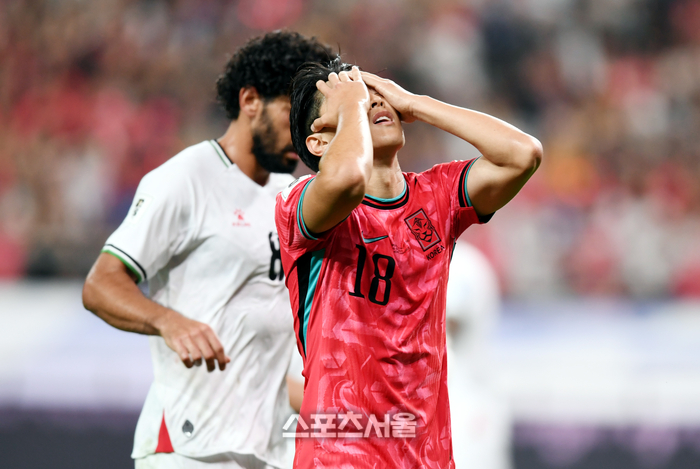 이강인이 5일 서울월드컵경기장에서 열린 2026 북중미월드컵 3차 예선 팔레스타인과 경기에서 골기회가 무산되자 아쉬워하고 있다.