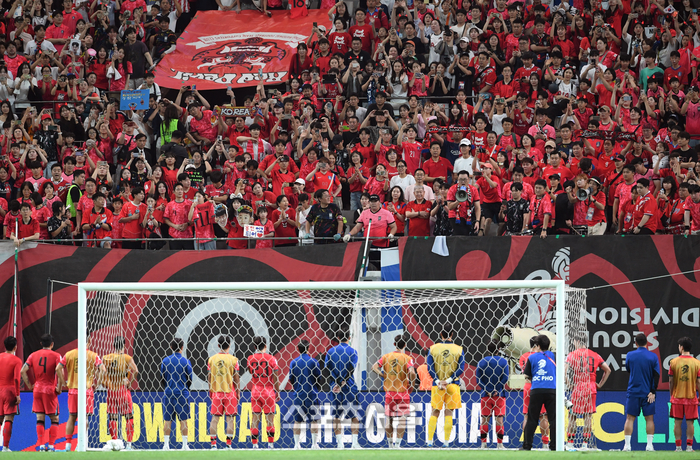 대한민국 축구대표팀이 5일 서울월드컵경기장에서 열린 2026 북중미 월드컵 아시아지역 3차 예선 팔레스타인과 경기에서 0-0 무승부를 기록한 뒤 붉은 악마 앞에 서서 인사를 하고 있다. 2024. 9. 5.