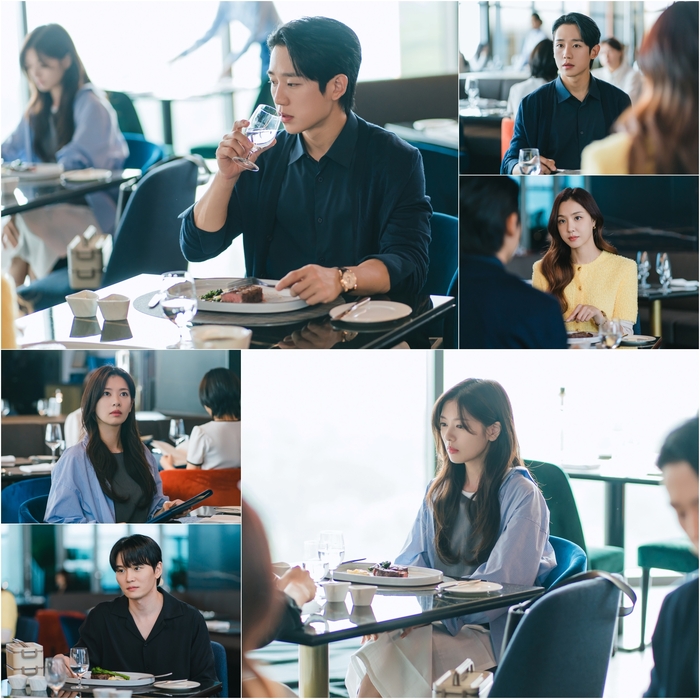 특히 최승효와 장태희, 배석류와 송현준이 각각 다른 테이블에서 마주하고 있다는 점이 흥미롭다. 앞에 앉은 상대와의 대화보다 옆 테이블의 서로에게 온통 신경을 집중한 최승효와 배석류의 어색하고 불편한 표정이 눈길을 끈다. 여기에 이들의 묘한 기류를 감지한 장태희와 송현준의 반응까지 숨 막힐 듯한 긴장감을 더한다.