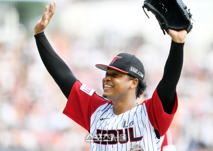 LG 에르난데스가 8일 잠실구장에서 열린 2024 KBO리그 한화와 경기 5회초 수비를 마친 뒤 관중석을 향해 인사를 하고 있다. 에르난데스는 5이닝 2실점(2자책)을 기록하며 승리 투수 요건을 갖췄다. 2024. 9. 8.
