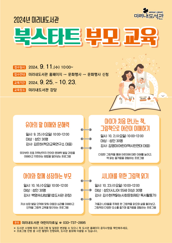 교육은 미리내도서관 강당에서 9월 25일부터 10월 23일까지 매주 수요일 오전 10시, 총 4회에 걸쳐 진행될 예정이다.
