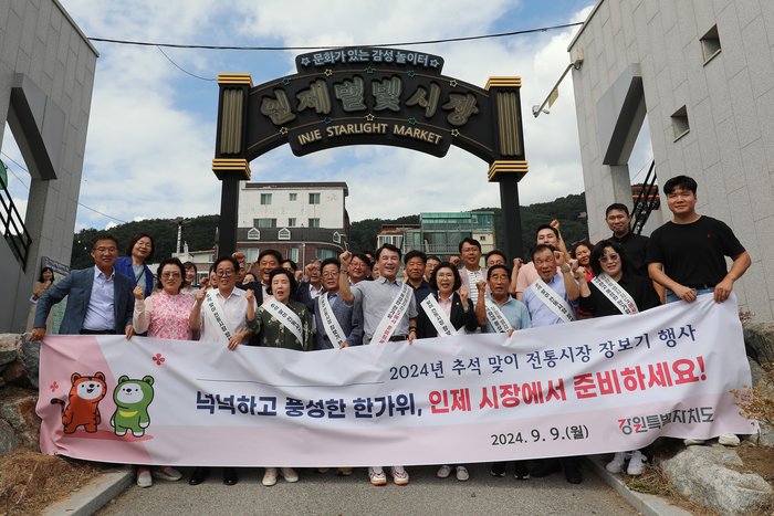 [스포츠서울ㅣ김기원기자]인제군은 9월 9일 인제전통시장 일원에서 김진태 강원특별자치도지사와 최상기 인제군수 등 30명이 참석한 가운데 지역경제 활성화를 위한 ‘추석맞이 전통시장 장보기 행사 및 물가안정 캠페인’을 실시했다.