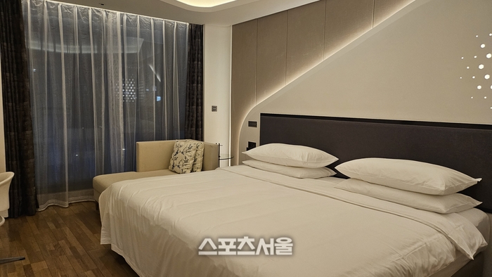 객실에 들어서면 성인 4명은 누울 수 있는 스마트 대형 침대가 눈에 띈다. 침대 주변에는 방 온도 습도 조절·불/커튼 온 오프 등을 설정할 수 있는 버튼이 있는데, 이것 또한 티몰 지니 스마트 비서가 있어 음성으로 조절할 수 있다.