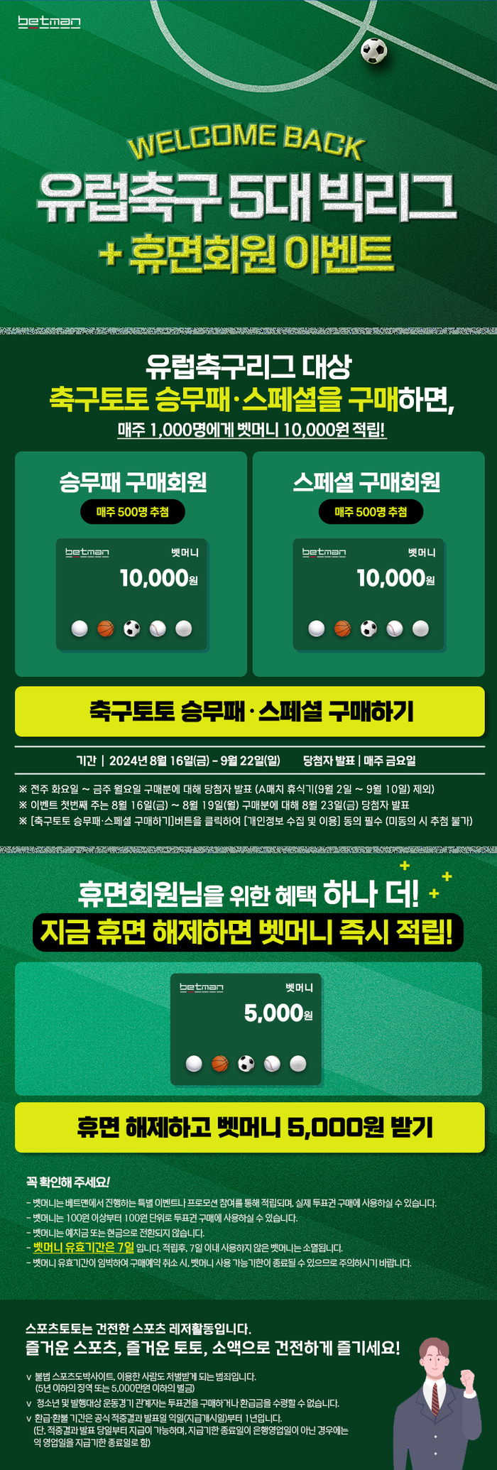 휴면회원을 대상으로도 벳머니를 지급하는 이벤트도 전개 중이다. 해당 이벤트는 축구 팬들의 인기가 높은 유럽리그 개막을 맞이해 베트맨에서 활동을 하지 않은 휴면 고객을 대상으로 휴면 해제를 독려하고자 기획됐다. 참여방법은 프로모션 기간 동안 베트맨에 재접속하고 휴면 상태를 해제하면 참여가 완료되며, 참여 완료한 회원 전체에게 5000원 상당의 벳머니가 지급된다.