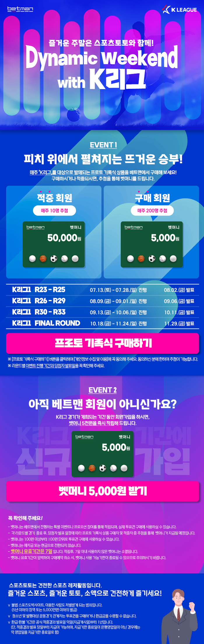두번째 이벤트는 K리그 경기가 개최되는 기간 발매되는 ‘프로토 기록식’ 상품을 구매한 후 참여가 가능한 이벤트다. 상품을 구매한 회원 중 적중된 회원에게는 매주 10명을 추첨해 5만원권의 벳머니를 지급하고, 구매 회원에게는 매주 200명을 추첨해 5000원권의 벳머니를 지급한다. K리그1의 각 라운드 일정과 이벤트 당첨자 발표일은 베트맨의 이벤트 페이지를 참고하면 된다