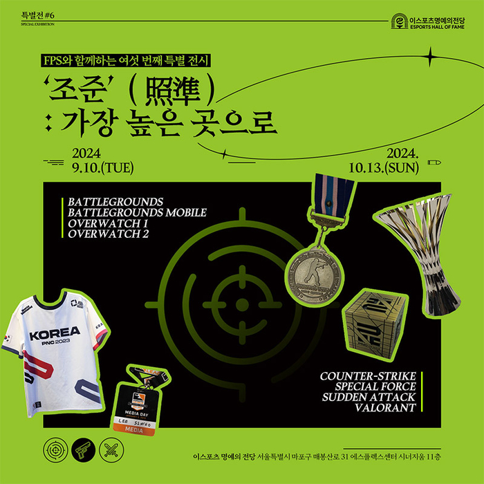 [스포츠서울 | 김민규 기자] 배틀그라운드·발로란트 등 1인칭 슈팅게임(FPS) e스포츠 명예의 전당 여섯 번째 특별전 ‘조준(照準): 가장 높은 곳으로’가 열린다. 국내 FPS 종목의 시작부터 역사를 조명하고 다시 한 번 세계 정상으로 도약을 준비하는 과정을 담았다.