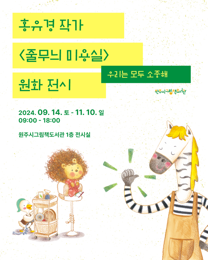 [스포츠서울ㅣ원주=김기원기자]원주시그림책도서관은 9월 독서의 달을 맞이하여 ‘우리는 모두 소중해’라는 주제로 홍유경 작가의 《줄무늬 미용실》 그림책 원화를 전시한다.