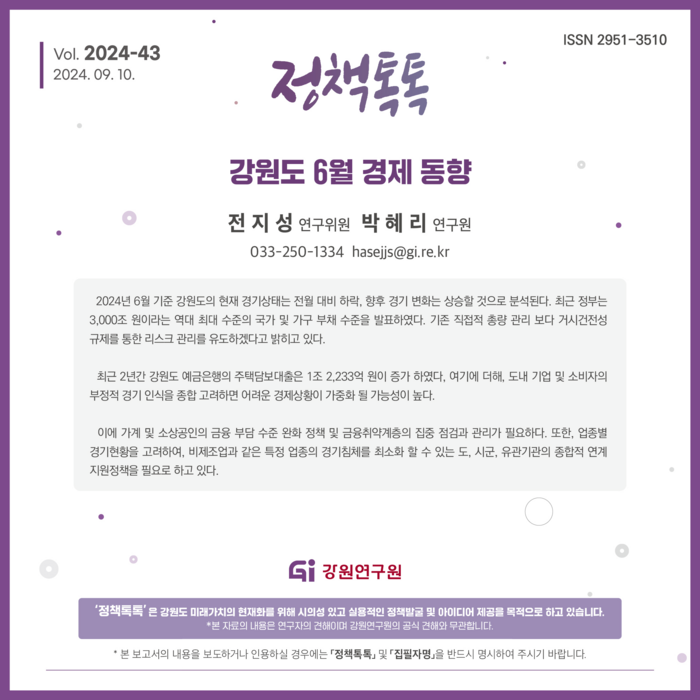 [스포츠서울ㅣ춘천=김기원기자]강원연구원(원장 현진권)은 “강원도 6월 경제 동향”이라는 제목으로 2024년 제43호 정책톡톡을 발간하였다.
