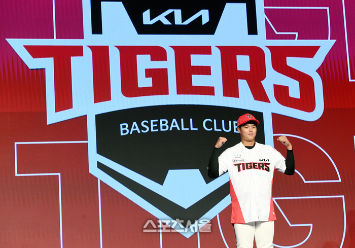 덕수고 투수 김태형이 11일 서울 송파구 롯데호텔 월드 크리스탈 볼룸에서 열린 ‘2025 KBO 신인 드래프트’에서 전체 5순위로 KIA에 지명된 뒤 취재진을 향해 포즈를 취하고 있다. 2024. 9. 11.