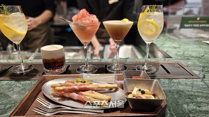내부로 입장하니 바리스타들이 다양한 음료를 선보이고 있다. 그중 일반 스타벅스 매장에서는 볼 수 없었던 바 전용 테이블과 칵테일 음료가 눈에 띈다. 해외 스타벅스에서만 선보였던 ‘믹솔로지 바’다. 장충라운지R점에 처음 도입된 것이다.