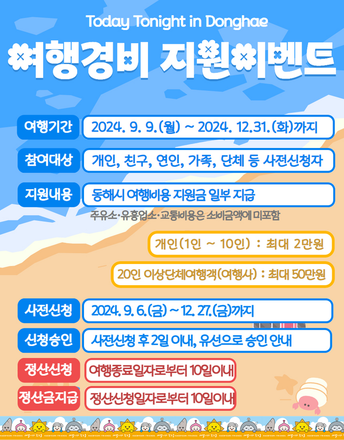 동해를 마음껏 즐기고 여행종료일 10일 이내에 필요한 자료를 입력하여 정산 신청을 하면 소규모 단위 관광객의 경우 당일 1만원, 1박은 2만원을 현금으로 지급한다. 또한, 20인 이상 관광객을 모집한 여행사의 경우 1박 40만원, 2박 50만원을 현금으로 지원한다.
