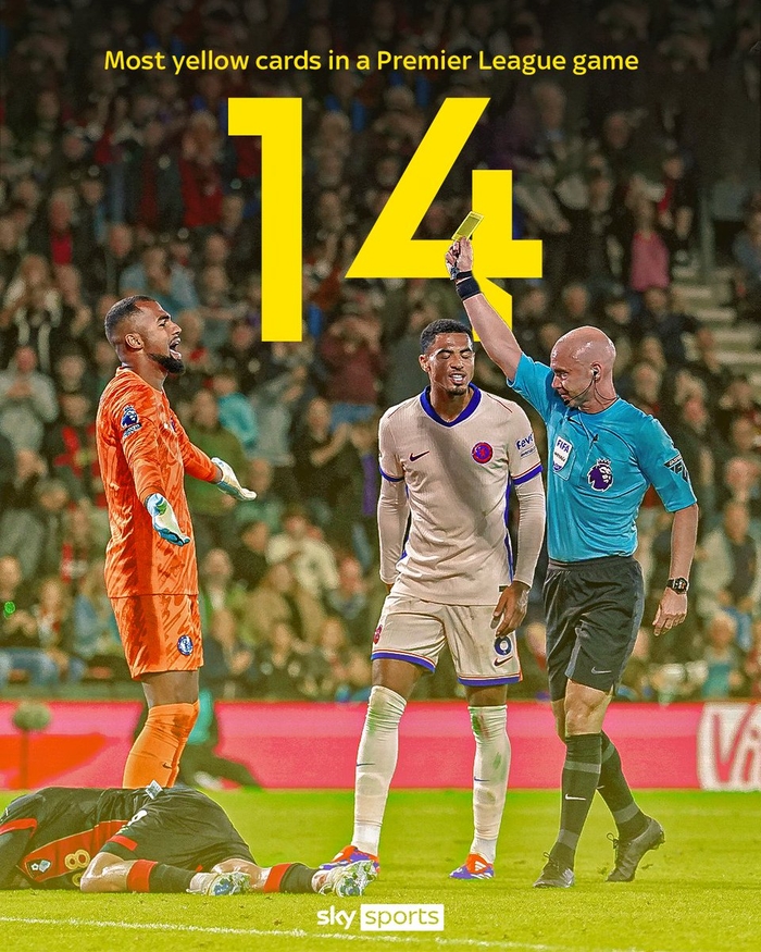두 팀은 치열한 경기를 펼쳤다. 무엇보다 경고가 무려 14장이 쏟아졌다. 이날 주심은 악명 높은 앤서니 테일러. 본머스 6장, 첼시 8장이었다. 첼시는 엔조 마레스카 감독도 경고를 한 장 받았다. 14장은 역대 EPL 한 경기 최다 기록이다.