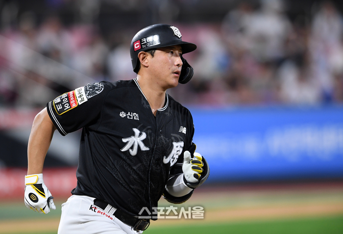 KT 황재균이 18일 수원 KT위즈파크에서 열린 2024 KBO리그 삼성과 경기8회말 1사 삼성 임창민을 상대로 솔로 홈런을 치고 베이스를 돌고 있다. 황재균의 시즌 13호 홈런. 2024. 9. 18.