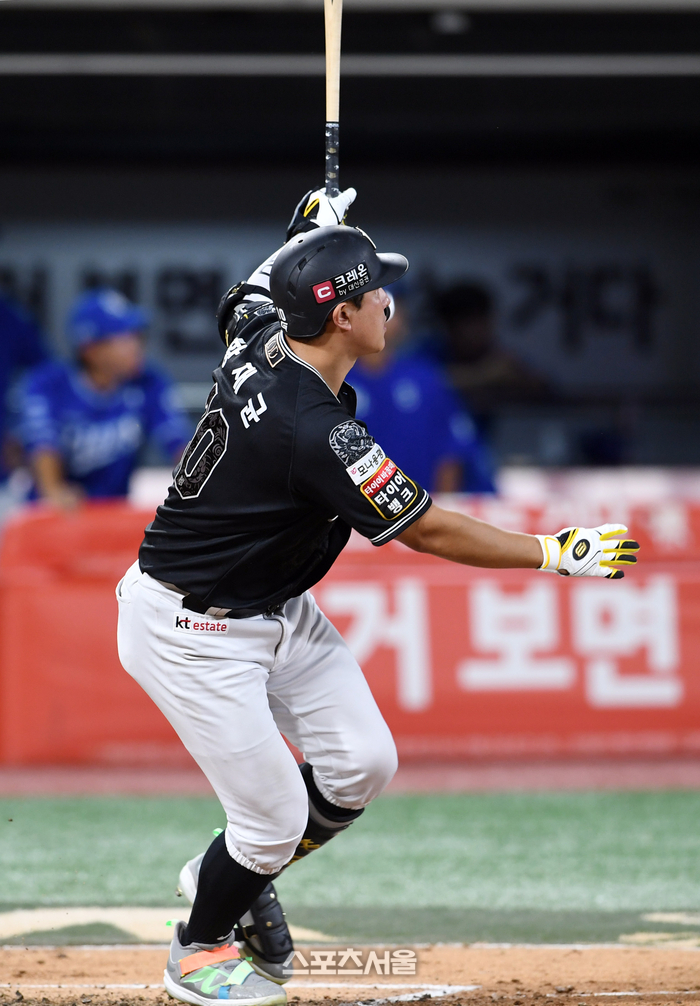 KT 황재균이 18일 수원 KT위즈파크에서 열린 2024 KBO리그 삼성과 경기8회말 1사 삼성 임창민을 상대로 솔로 홈런을 치고 있다. 황재균의 시즌 13호 홈런. 2024. 9. 18.