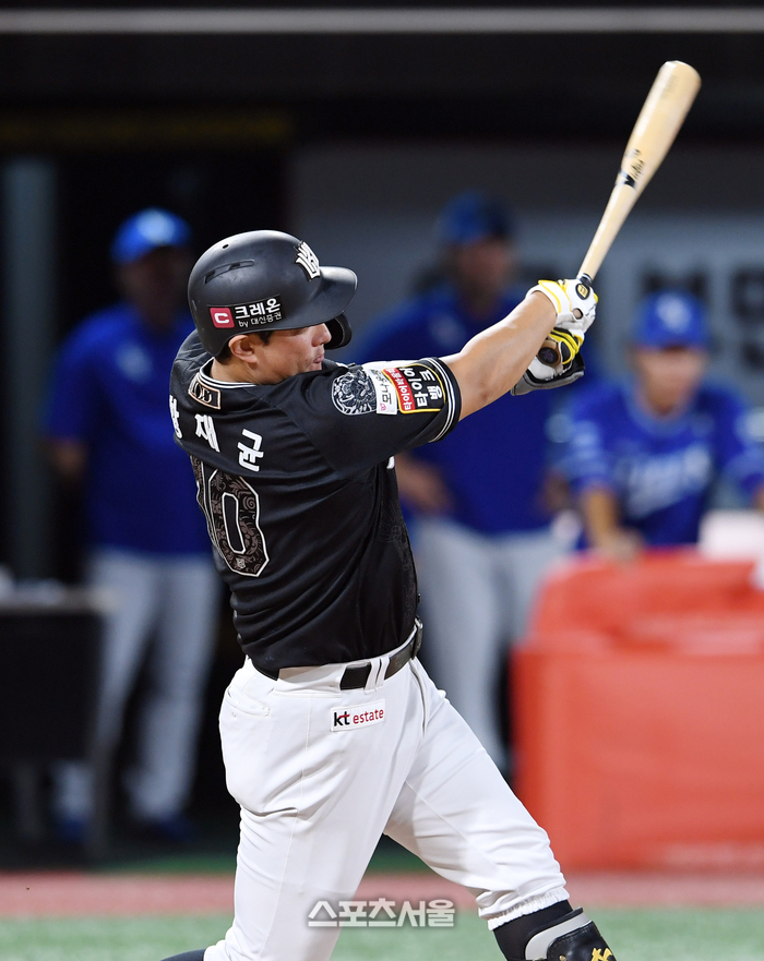 KT 황재균이 18일 수원 KT위즈파크에서 열린 2024 KBO리그 삼성과 경기8회말 1사 삼성 임창민을 상대로 솔로 홈런을 치고 있다. 황재균의 시즌 13호 홈런. 2024. 9. 18.