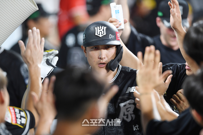 KT 황재균이 18일 수원 KT위즈파크에서 열린 2024 KBO리그 삼성과 경기8회말 1사 삼성 임창민을 상대로 솔로 홈런을 치고 동료들과 하이파이브를 하고 있다. 황재균의 시즌 13호 홈런. 2024. 9. 18.