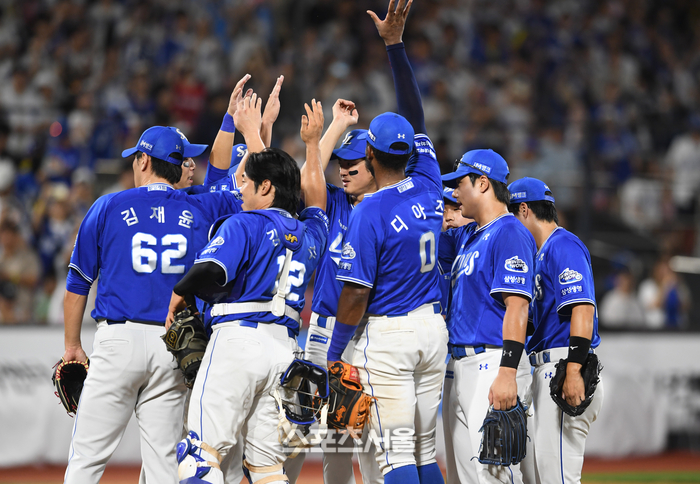 삼성 선수들이 18일 수원 KT위즈파크에서 열린 2024 KBO리그 KT와 경기에서 승리한 뒤 하이파이브를 나누고 있다. 삼성은 3연패에서 탈출했다. 2024. 9. 18.