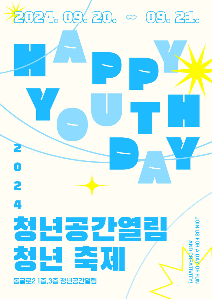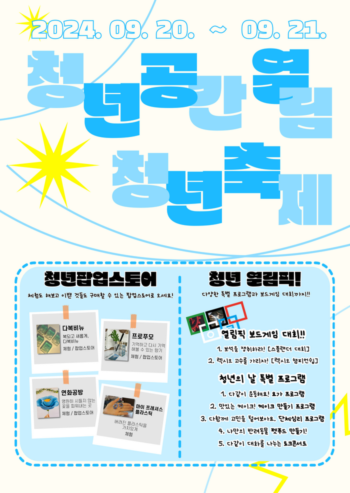 ‘청년과 함께하는 청년의 날’을 주제로 20일부터 21일까지 이틀간 열리는 청년공간 열림에서 열리는 2024년 청년의 날 행사는 메인행사인 보드게임대회 열림pick을 시작으로 다복비뉴, 프로푸모, 연화공방 등에서 체험할 수 있는 팝업스토어를 열고, 청년동아리 체험(사진 촬영, 연주회 등), 펫푸드 만들기, 베이킹 만들기 등 다양한 프로그램을 마련했다.