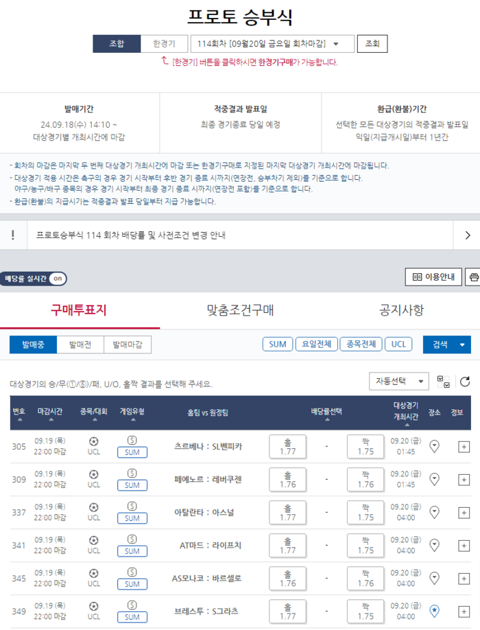 프로토 승부식 114회차에서 ‘SUM’ 유형에 해당하는 경기는 츠르베나 즈베즈다-SL벤피카(305번)전을 비롯해 페예노르트-레버쿠젠(309번), 아탈란타-아스널(337번), AT마드리드-라이프치히(341번), AS모나코-바르셀로나(345번), 브레스투아-슈투름 그라츠(349번)전이 선정됐다.