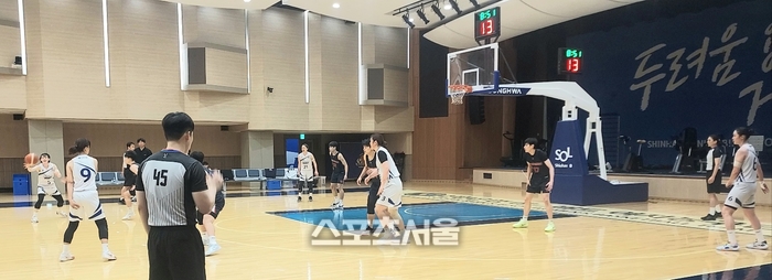 신한은행은 19일 용인 신한은행 블루캠퍼스 전용 체육관에서 열린 쌍용고와 전·후반 10분씩 2경기를 치렀다. 첫 번째 경기에선 17-55로 완패했지만, 두 번째 경기에선 나름 분전하며 41–48로 경기를 마쳤다. 이후 10분 한 쿼터 더 경기를 진행한 뒤 이날 연습경기를 마무리했다.
