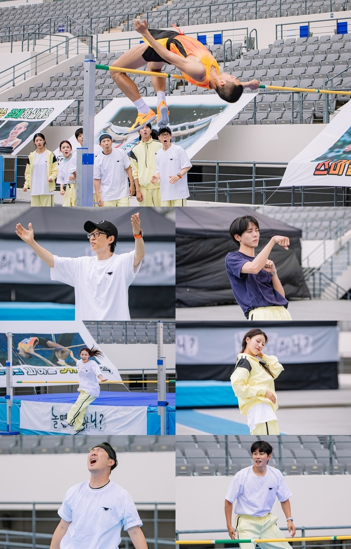 ‘유느님’이 강림한 듯 두 팔을 하늘을 향해 뻗은 유재석의 모습부터 ‘냥냥 펀치’를 휘두르는 주우재, 춤을 추는 미주까지 개성 넘치는 포즈가 눈길을 끈다. 박진주는 세상에서 가장 행복한 표정으로 높이뛰기를 하는 반면, 포효하는 하하와 이이경의 모습은 어떤 의미일지 호기심을 자극한다. 의외의 멤버가 이날 높이뛰기 최고 기록을 경신, ‘운동 부심’을 자랑하던 이이경을 좌절하게 만든다.