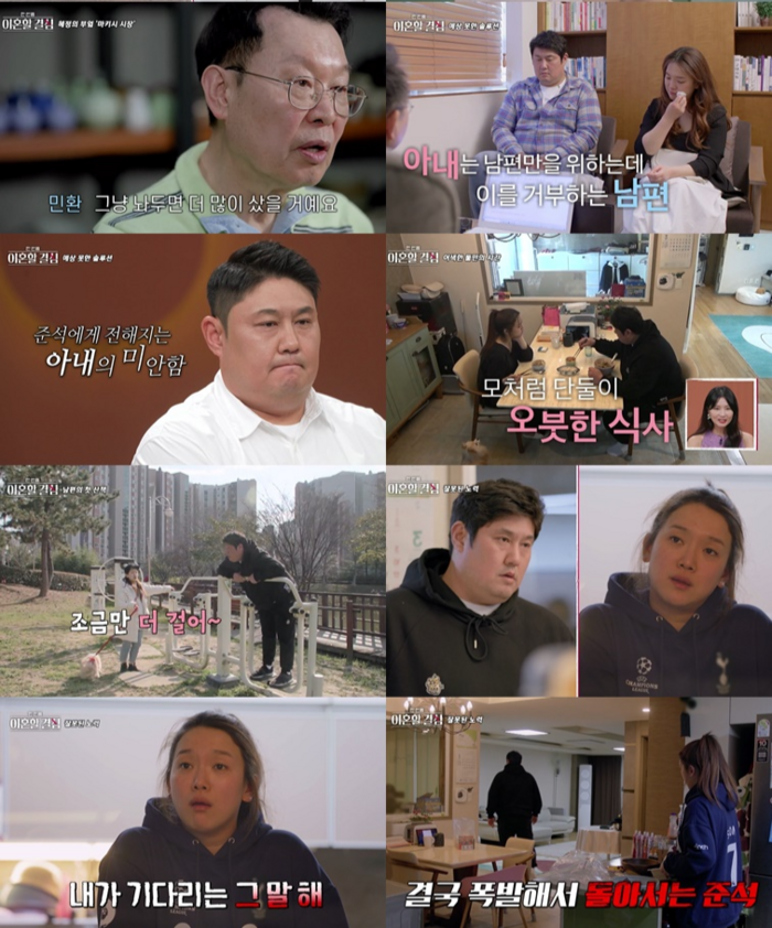 결국 폭발한 최준석은 집을 나가버렸다. 스튜디오 출연진들마저 어쩔 줄 몰라 하는 가운데, 두 사람이 과연 오랜 갈등을 봉합할 수 있을지에 관심이 쏠렸다.